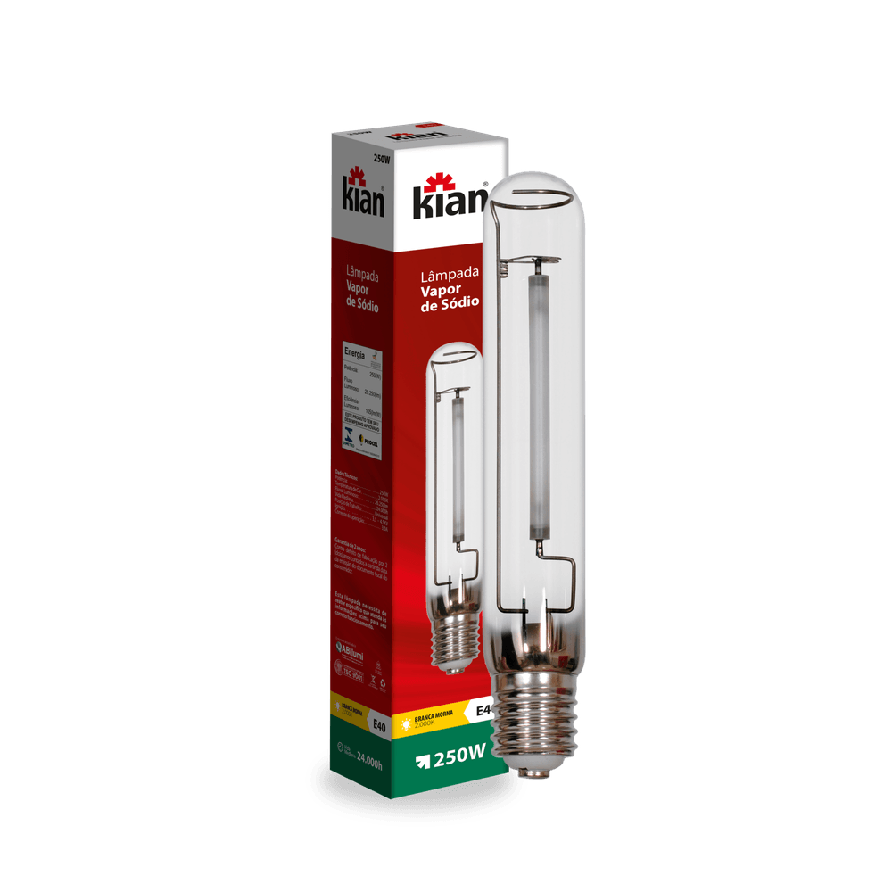 Lâmpada HID Vapor de Sódio 250W 2.000K Branca Quente Base E40 24.000H Kian