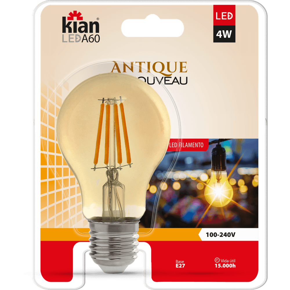 Lâmpada Led Antique Noveau Bulbo A60 4W 2.200K Base E27 Branca Quente Bivolt Kian