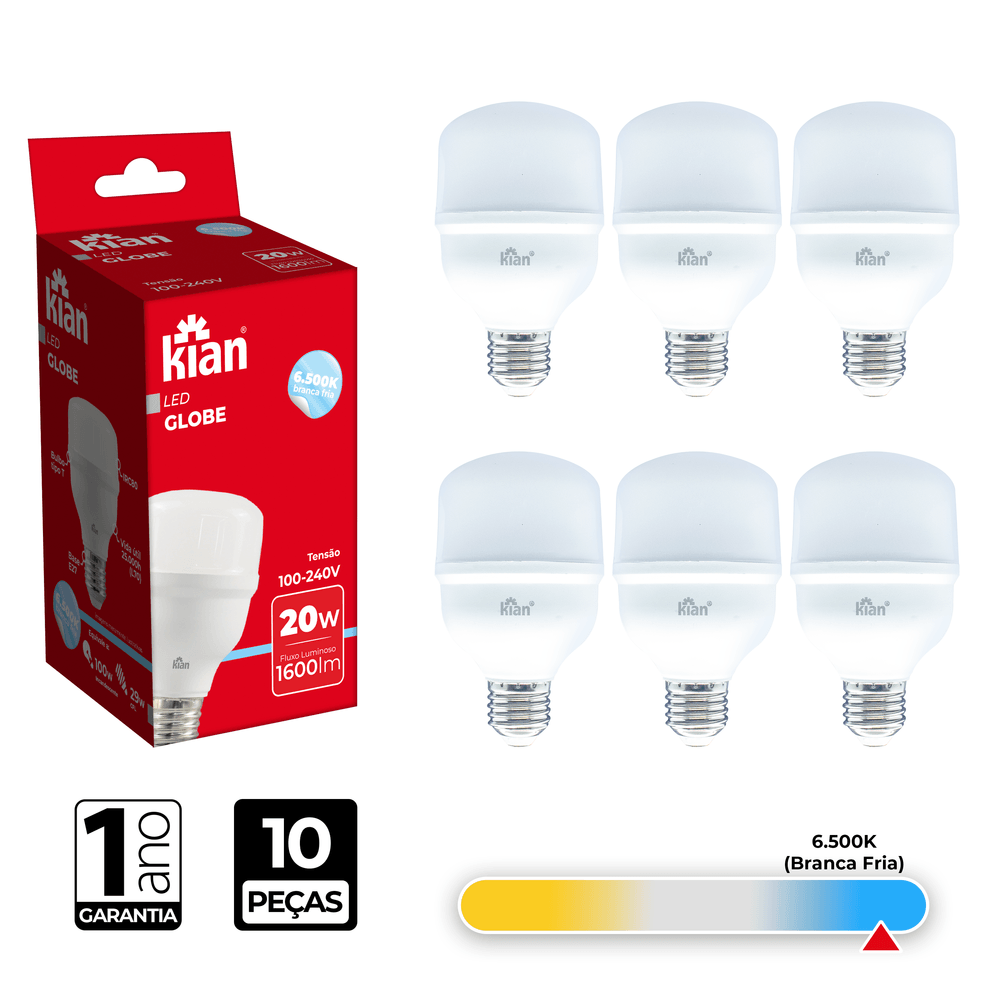 Lâmpada Led Globe 20W 6.500K Branca Fria Base E27 Bivolt Kian Cx/10