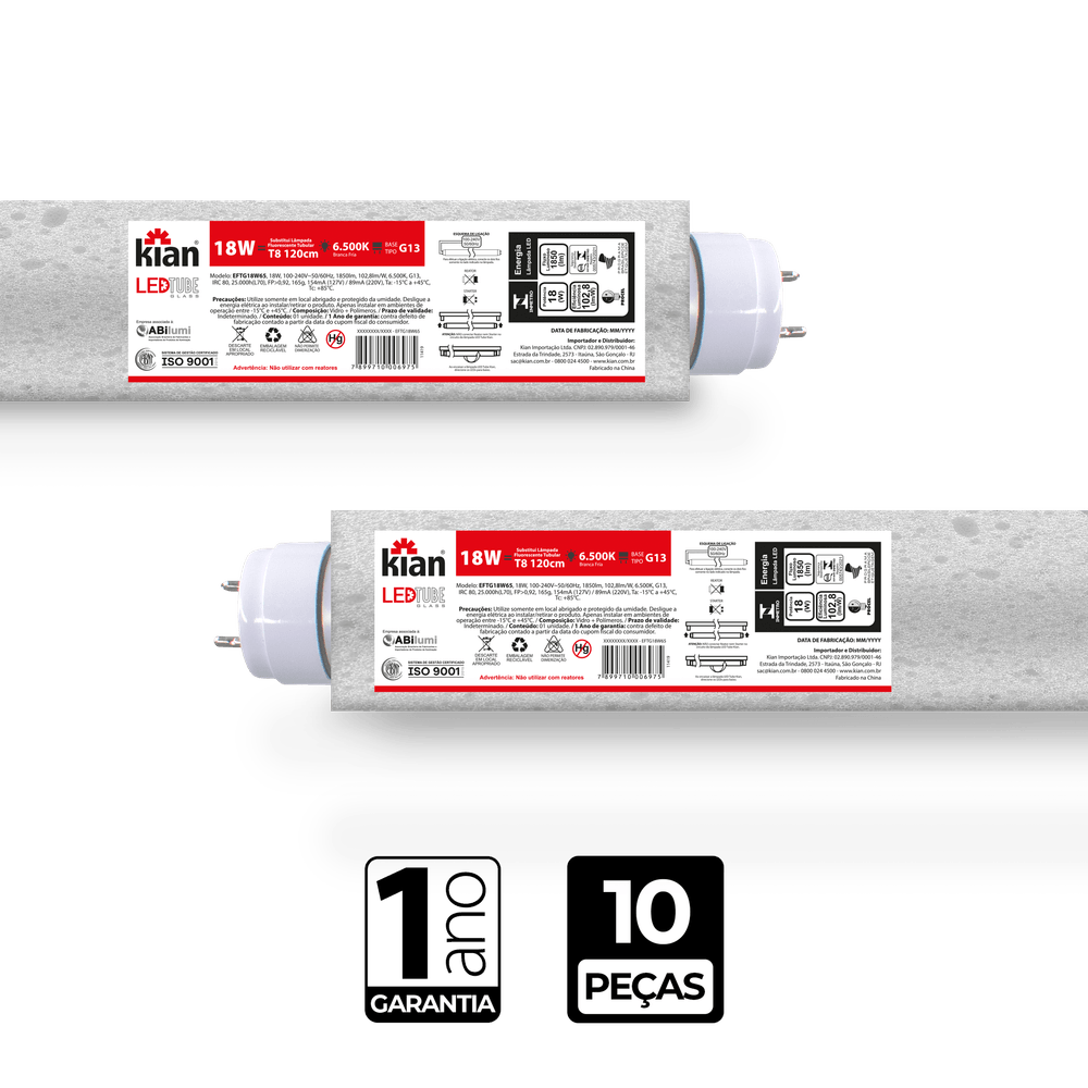 Lâmpada Led Tube Glass 18W 6.500K Branca Fria Bivolt Kian - CX/10
