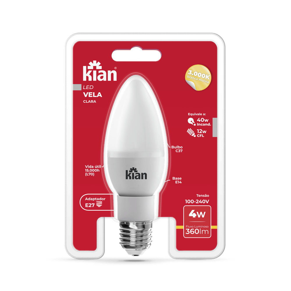 Lâmpada Led Vela Bulbo Claro 4W 3.000K Branca Quente Base E14 Bivolt Kian