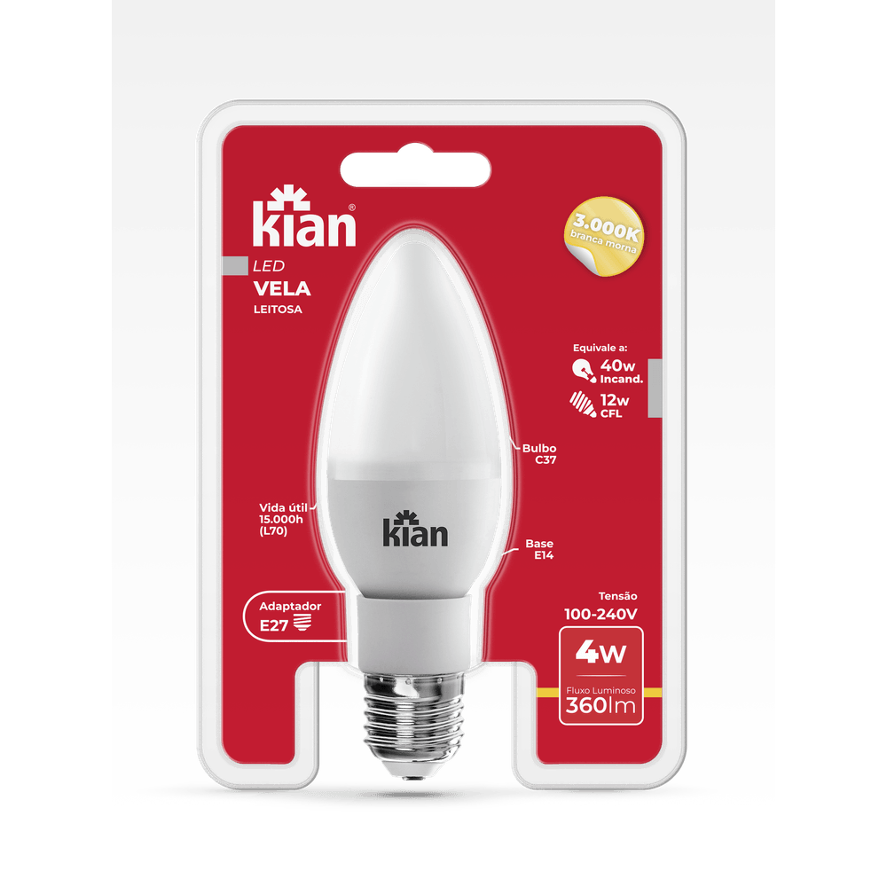 Lâmpada Led Vela Bulbo Leitoso 4W 3.000K Branca Quente Base E14 Bivolt Kian